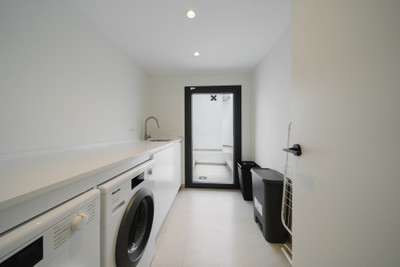 The main living spaces connect easily to the outdoor areas, allowing for a relaxed and open atmosphere. Large terraces offer plenty of room for outdoor dining, sunbathing, or simply enjoying the surroundings. The garden has been designed to be easy to maintain while still providing a pleasant setting around the house. An outdoor gym area adds a practical feature for anyone who values an active lifestyle without leaving home.
