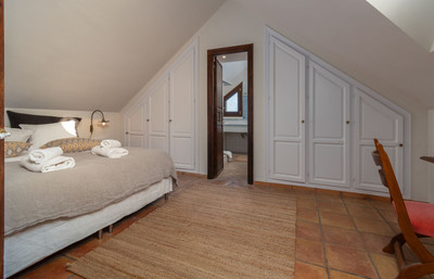 The second floor, connected by an open-plan staircase, seamlessly blends with the level below, where striking double-height ceilings enhance the sense of space and invite an abundance of natural light. On this level, a fourth en-suite bedroom is complemented by a converted attic of approximately 50 m². The T-shaped layout creates two additional sleeping areas along with a substantial walk-in closet. The angled ceilings introduce charm and a cosy, intimate feel.