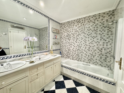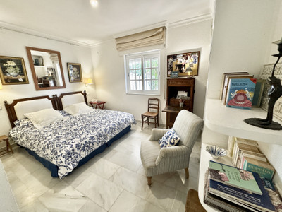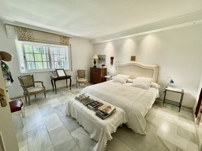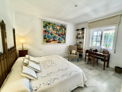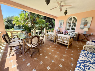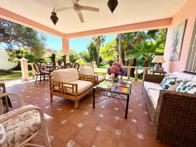 Beautiful family villa with a lot of charm located on the second line of the beach the well established urbanisation Linda Vista Baja, San Pedro de Alcántara. Built on a single floor, on a beautiful plot it has a very nice mature garden, with tropical plants and fruit trees. Due to its magnificent position, it is a very interesting renovation proyect. Just a few minutes walk to all kinds of services such as restaurants, international schools and shops. South facing, with beautiful views of the sea and to the mountains from the roof terrace. It consists of: cozy covered porch very privated with views to the garden. Spacious living room with dining area and fireplace, large fully equipped kitchen with breakfast area and laundry room. In total there are 6 double bedrooms with built-in cupboards + 1 maid's bedroom and 3 bathrooms. The master bedroom is very spacious with its en-suite bathroom and office. Maid's room with shower room. On the East side of the house, there is a very cozy patio, ideal as a summer dining room for the whole family covered with awnings. Private garage and outdoor parking area for several cars. Air-conditioning. Solar panels.