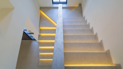 The ground floor features an open-plan layout, seamlessly integrating the living room, kitchen, and dining area. Floor-to-ceiling Reynaers panoramic windows flood the space with natural light while offering stunning views of the surrounding landscape.