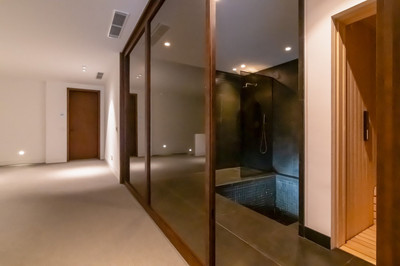 The lower level is dedicated to leisure and wellness, including a pre-installation for a Trackman golf simulator, sauna, cold plunge, fully equipped laundry, and ample storage. The garage accommodates three cars, with additional technical and storage rooms.