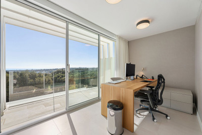 The top floor features a bright, spacious bedroom currently used as an office, a separate bathroom, and access to a vast rooftop terrace, an exceptional space for al fresco dining, lounging, or adding a private spa, all while enjoying sweeping golf and sea views.