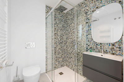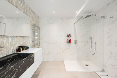 On the garden level, four spacious bedrooms open directly to the pool and landscaped grounds, creating a private retreat for family and guests. Elegant bathrooms with walk-in showers and refined finishes enhance the sense of comfort and style, while the connection to the poolside terrace makes this floor ideal for relaxed, resort-like living.