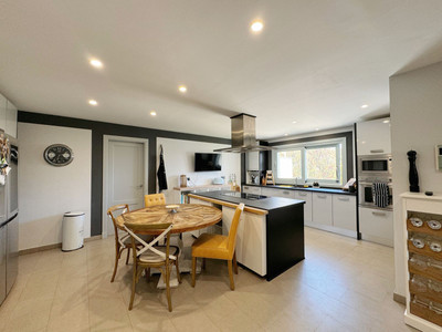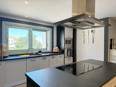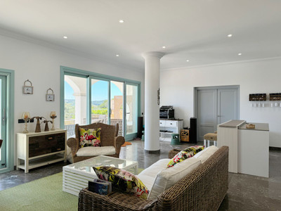 On the main floor, a grand entrance hall welcomes you, leading to a spacious living-dining room with fireplace, flooded with natural light from large windows and access to a panoramic terrace. The modern kitchen with island is complemented by a pantry, laundry area, and patio. Three en-suite bedrooms, two with private terraces, and a separate office with its own bathroom complete this level.