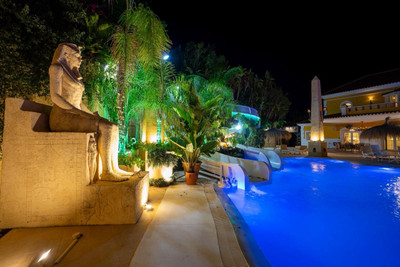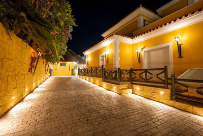 Located in Zone G of Sotogrande Alto, this large luxury villa was built by the current owner over a period of 10 years to a very high standard, using state-of-the-art materials and a wide selection of incredible crystal chandeliers. The large entrance hall features two curved marble staircases leading to the upper floor, where there are three bedrooms, one of which is the master suite, with Egyptian-themed décor, hand-painted walls, ornate moldings, and solid stone pillars. There is also a private living area overlooking the garden and pool. There is a dressing room and the main en-suite bathroom with a whirlpool tub and double walk-in shower. Two other spacious bedrooms, both en-suite, are located on this floor, connecting to the private terrace and from there, up the stairs to the private solarium. Inside the villa there is an elevator serving all 3 floors and on the ground floor there is the large living room, dining room, and doors to the covered terrace and pool area. There is also a service kitchen with pantry, utility room, and laundry/storage room. There is also a fully equipped cinema room with 8 leather seats. In the semi-basement is the entertainment suite, all decorated and hand-painted in an Egyptian theme, with matching decorations. There is a poker table, seating areas, a large cocktail bar, a modern gym with changing rooms and showers, and two further bedrooms with en-suite bathrooms, also in Egyptian style. In the center of the living room is a miniature theater modeled after London's West End theater, with two boxes and 37 seats. Luxuriously decorated in theatrical style, it comes with the complete set and props for a production of the musical Phantom of the Opera and offers a complete sound and lighting system, as well as the potential to show movies with the cinema system and stage for small private concerts. Work on the villa and grounds has not been completed, but this is a unique and personalized property, well worth viewing for the buyer looking for that special style home.