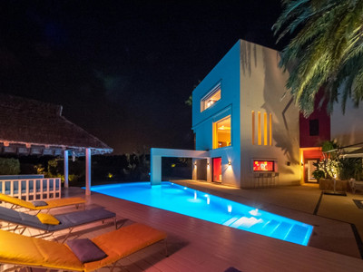 The main rooms, decorated with the nicest Georgetti furniture and kitchen all have access to the outdoor with certain areas having the Barragan-specific strong colours. Bright walls accentuate the space on the terraces near the Koi pond and the sun protected outside BBQ area, which connects to a split-level garden with fountain and strong colour wall surrounding, protected to wind and offering total privacy. The infinity swimming pool with stunning Siccis mosaic, IPE wooden terrace and Mexican style hut. The most dramatic style part of this mansion is the spacious outdoor living area with glass roof and electric sculpted lattice shutters which play with ever changing quality of light and shade from roof and front part separating the garden without taking away the sea view.