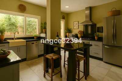 A large, modern kitchen with abundant storage, connected directly to the courtyard for effortless entertaining.