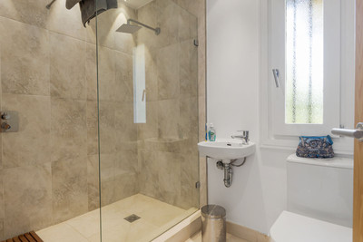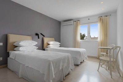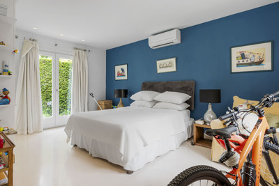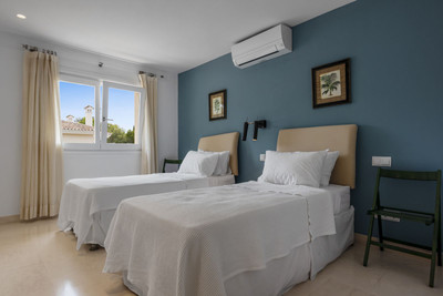 The upper level boasts two large bedrooms with en-suite bathrooms, both leading onto a spacious terrace overlooking the gardens and pool. Additionally, there are two more bedrooms sharing a bathroom, along with a separate informal lounge/TV room.