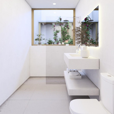 The project blends a contemporary interpretation of Andalusian architecture with a modern, refined design. The palette of neutral tones, warm whites, and natural wood creates an elegant and timeless aesthetic.