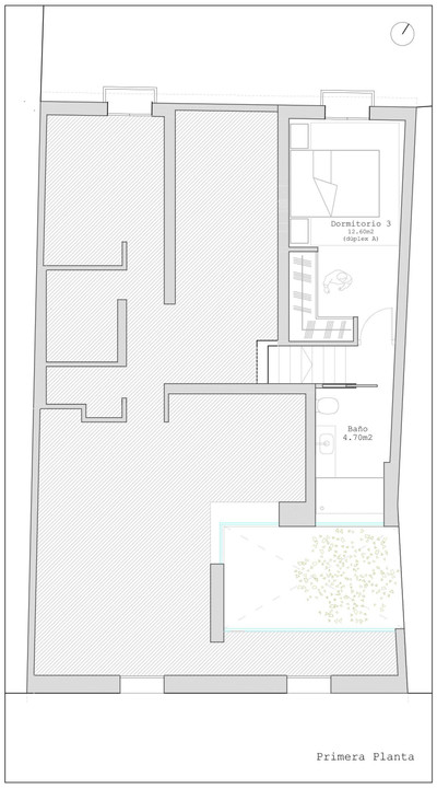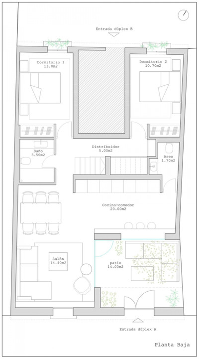 The ground floor features a spacious open-plan living, dining, and kitchen area, seamlessly connected to a charming 14 m² interior patio that provides abundant natural light and ventilation. This level also offers two bedrooms, a full bathroom, and a guest toilet.