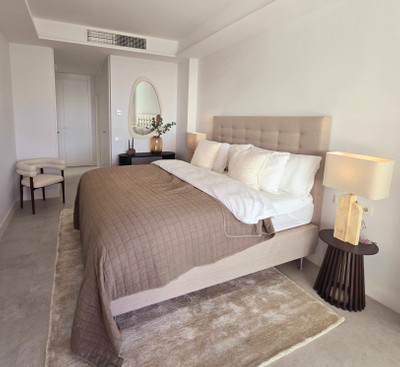 The apartment offers four spacious and bright bedrooms, each with its own en-suite bathroom. The master bedroom stands out for its direct access to the outdoor area, luxurious bathroom, and generous built-in wardrobes. One of the bedrooms adjacent to the living area is currently used as a cozy TV room.