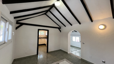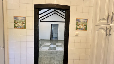 You enter through a covered porch. The main door leads to a living room that has a fabulous beamed high ceiling and a lovely wood burning stove. From here, you can go up a few stairs to a dining room with a Cathedral vaulted ceiling. The kitchen is fully fitted and also has a high vaulted ceiling. The kitchen is a separate room but can easily be made open-plan to the dining room for those who may prefer an integrated living environment.