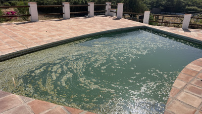 Walking out of the main house, you walk down to a large terrace which then leads down to your private pool and garden that goes all the way to the river. To the right, you have the paddock and stables. The main house and its plot is all fenced in. The house has its own well.