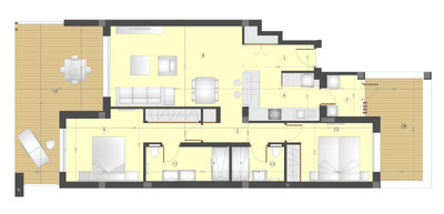 The bright open-plan living and dining area flows naturally to the west-facing terrace and private garden, creating a seamless connection between indoor comfort and outdoor leisure. Floor-to-ceiling windows fill the space with natural light and frame beautiful views to the communal gardens and swimming pools. Premium specifications include underfloor heating throughout, central A/C, an advanced heat pump system, ultra-fast fiber internet, and tasteful furnishings that exude modern sophistication.