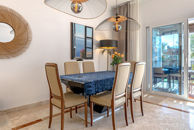 Welcome to this modern and stylish home in the popular Paraiso Pueblo in Benahavís. Here you are greeted by a bright residence with an open-plan layout where the kitchen and living room blend harmoniously together. The kitchen is tastefully designed with decorative tiling, integrated appliances, and a spacious kitchen island that creates a natural gathering point.