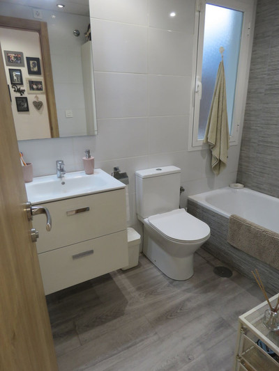 This well maintained ground floor garden apartment has so much to offer. It has an amazing outside space. A covered seating area and plenty of space for sunbathing and the BBQ. There is direct access to the community garden with pool. Inside we have two good size bedrooms and two bathrooms of which one ensuite. The semi open kitchen comes with all appliances including a wine fridge. There is also a large utility room. The property comes with underground parking and large storage. The small urbanization is extremely well maintained and has a large swimming pool area. Last put definitely is the location. This apartment has everything on its door step. Including the beach, Lidl, MacDonalds and many more shops, bars, and restaurants. All within a 5 minutes walk. This apartment sounds to good to be true? Well in this case it is true. This will not be around for long.