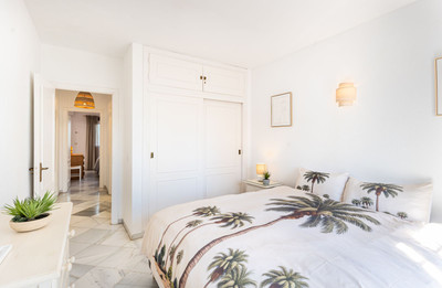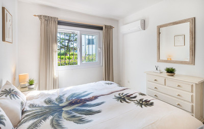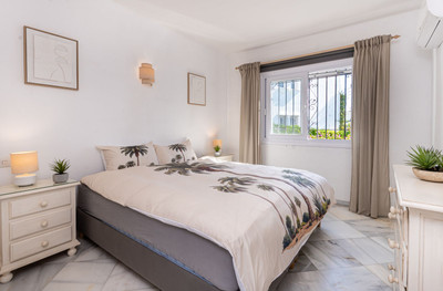 The Master bedroom with a super king bed equipped with double panelled wardrobes and offers views to the tropical gardens – Adjacent luxurious Andalucian master bathroom designed with an immaculate white marble integrated vanity unit with purpose built white carpentry, a porcelain bathtub with shower, double windows and integrated spots to the ceiling. A further guest bedroom with ensuite bathroom offers 2 beds with beautiful garden views.
