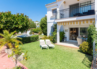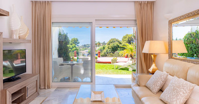 Exceptional Exquisite One Level Garden Apartment with a high interior specification offering open tropical views situated El Paraiso Alto Benahavis, enviably positioned within a prestigious Andalucian community consistently chosen by industry professionals as a top recommended golf and residential choice, designed within outstanding tropical gardens offering direct access onto the famous El Paraiso 18 hole golf course green. The property benefits from corner positioning within immaculately maintained flat tropical palm and floral gardens offering open tropical views with distant golf and sea views from the garden.