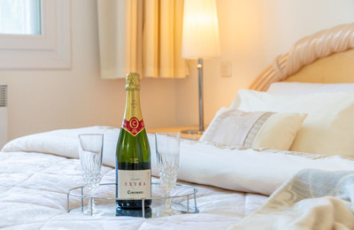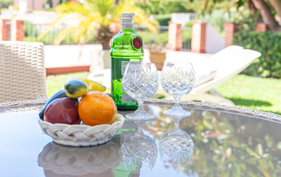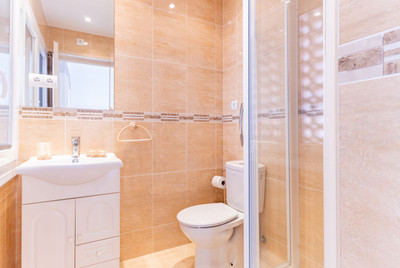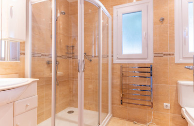 Impressive guest double bedroom with a renovated ensuite bathroom. Air-conditioning installed throughout all main rooms. The property exterior terrace is covered for protection and equipped with extendable awning over the exquisite garden area equipped with a high standard rattan dining suite and sun beds.