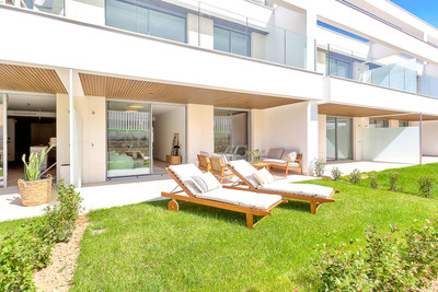 The apartment offers 2 bedrooms and 2 bathrooms, with a bright open-plan kitchen, dining, and living area that flows directly onto a private terrace and garden. Both the living room and the master bedroom have direct access to the outdoor space, creating a lovely indoor–outdoor living feel. There is plenty of storage with built-in wardrobes, and the master bathroom is en-suite and includes a bathtub.