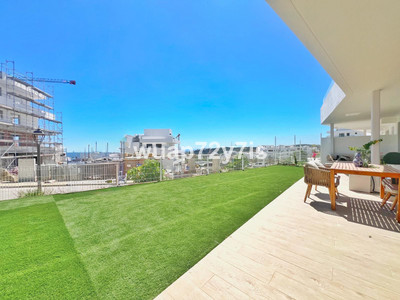 Upon entering the apartment, you are welcomed by a bright and spacious living room that combines a comfortable lounge with sofas, a dining area, and a fully equipped open-plan kitchen. Large sliding doors flood the space with natural light and provide direct access to the generous terrace. To the left lies the first bedroom with its own en-suite bathroom, while further along you will find the master bedroom, also featuring an en-suite and direct access to the terrace.