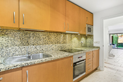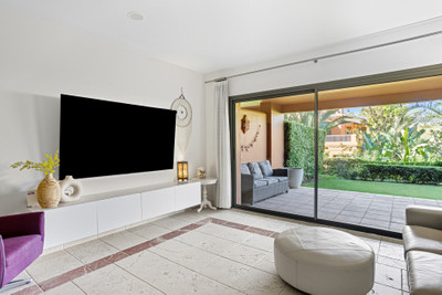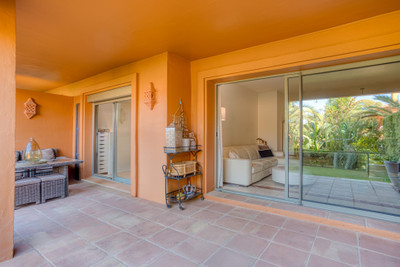 Wonderful two-bedroom, ground floor apartment located in the sought after gated community of Benatalaya, Estepona East. The community offers 24hr security, concierge, communal swimming pools, indoor heated pool, gym, sauna, hammam and is located next to local schools’ shops and a short drive to the beach. The property has an open plan living and dining room with direct access to the private terrace and garden; fully fitted kitchen; master suite with access to the terrace; guest bedroom; and guest bathroom. Other features include hot and cold air conditioning, underfloor heating in the bathrooms, electric shutters, private parking space and a storeroom. A perfect property for year-round living or holiday home.
