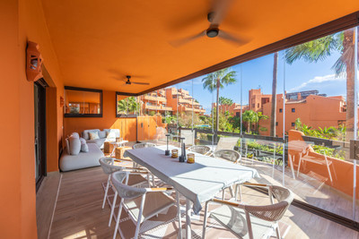 GROUND-FLOOR APARTMENT WITH LARGE TERRACE AND TOURIST LICENSE NEAR THE SEA. Privileged location in a charming Mediterranean-style complex, just 200 m from the beach and only a 5-minute drive from Estepona and the vibrant Duquesa Marina, where you’ll find all kinds of services, restaurants, and leisure options. This beautiful ground-floor apartment stands out for its brightness, thanks to its southeast orientation, and for its magnificent newly renovated terrace, featuring glass curtains, an outdoor kitchen area, and elegant parquet flooring that adds warmth and style.