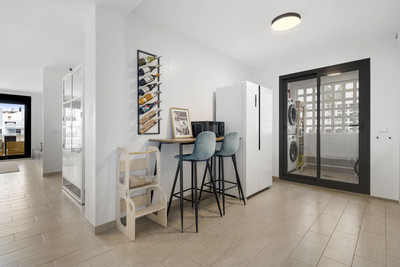 Upon entering, on the left side, there is a spacious, semi-open kitchen equipped with all necessary built-in appliances. Next to the kitchen, there is a separate, enclosed room where the washing machine and dryer are also located.