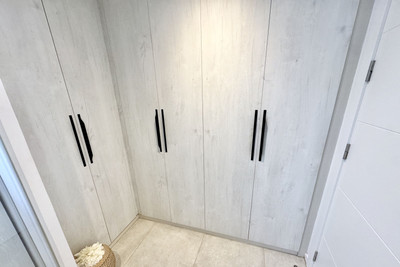 This modern luxury apartment offers; spacious lounge/ dining area with large open plan modern white high-gloss fitted kitchen. With fitted oven, hob, hood, fridge freezer, microwave. 3 large double bedrooms with fitted wardrobes, Master with patio doors to terrace, walk in wardrobe & luxury en-suite shower room. Plus a 2nd family shower room. Covered terrace (now with glass curtains) and private use garden offering views over development with mountain backdrop and partial sea views. Hot & cold air-con, private parking space and storage room. Interiors have a beautiful timeless design, with high quality finishes and feature neutral colour palettes.