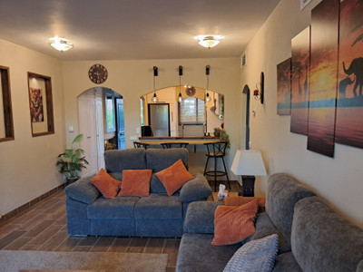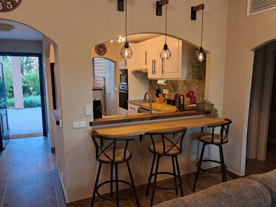 The apartment comprises two well-proportioned bedrooms and two modern bathrooms, including a stylish en-suite, as well as a guest toilet for added convenience. The open plan, fully fitted kitchen is equipped with high-quality appliances and is complemented by a separate utility and laundry room. The dining area flows seamlessly into the living space, which features a welcoming fireplace and direct access to the covered terrace, ideal for alfresco dining or relaxing in the Mediterranean climate. The property is offered fully furnished, with optional furniture packages available, and is in excellent, recently renovated condition.