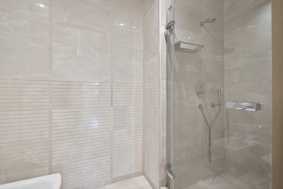 The master bedroom has direct access to the terrace and includes an en-suite bathroom with both a bathtub and a separate shower, along with a dressing area offering good storage space. The second bedroom is also well sized, benefits from natural light through large windows, and is served by a second bathroom finished to a similar standard.