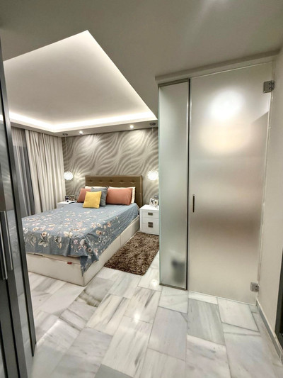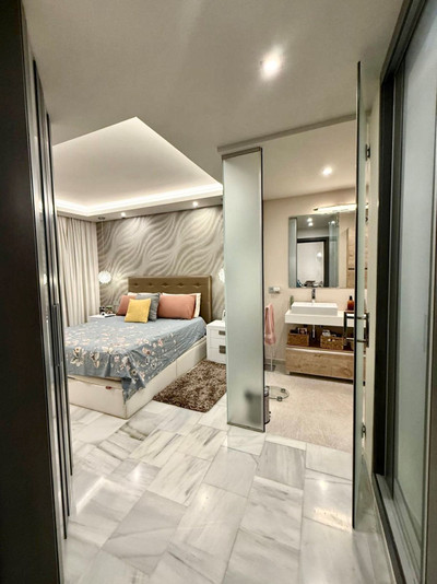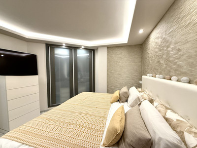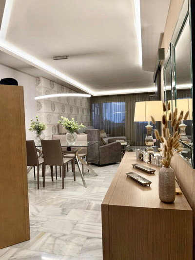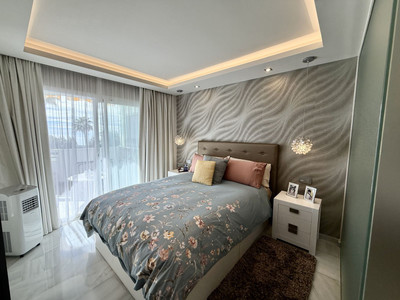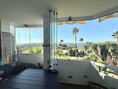 Stunning elevated ground floor apartment with panoramic sea views. Located in Calahonda, this recently refurbished apartment has been restyled and modernized to the highest of standards by El Cortes Ingles interior design. The property comprises of hallway, large lounge/dining room and a luxury kitchen with utility area. In addition there are 2 bedrooms with built in wardrobes and 2 bathrooms, the master bedroom having this facility en-suite and with patio door access to the large south facing terrace. The terrace is also accessed via patio doors from the lounge and has the fabulous benefit of glass curtains, allowing all weather use , from which panoramic sea and garden views can be enjoyed. The complex is immaculately maintained with fantastic sub tropical gardens and 2 swimming pools and ample open but secure parking areas. And located within easy walking distance of local bars, restaurants and a supermarket, with public transport nearby also. Luxury furnishings are available as an optional extra purchase.