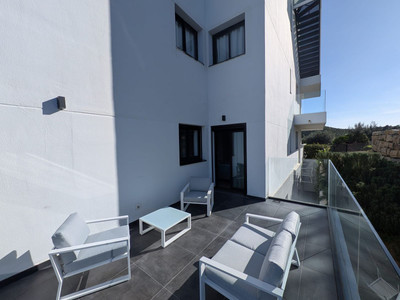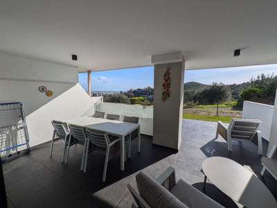 Built in 2023 and presented in excellent condition, the apartment features three bedrooms and two bathrooms, with a bright and exceptionally spacious living area that flows directly onto expansive terraces. The southwest orientation ensures abundant natural light throughout the day, while panoramic views stretch across the Mediterranean Sea, the mountains, and the beautifully landscaped gardens and pool areas.