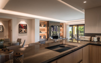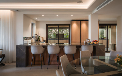 Designed across a single level for utmost comfort, the residence boasts a sophisticated layout. The custom wood-panelled entrance hall opens to a fully equipped open-plan Miele kitchen with an elegant breakfast bar, flowing seamlessly into a spacious living and dining area connected to a wraparound covered terrace and private garden with its own swimming pool. The property also benefits from a second Chef's kitchen featuring top-of-the-line equipment and fully enclosed with glass curtains that can be opened up completely during the warm summer days, converting it to your own fully functional outdoor kitchen.