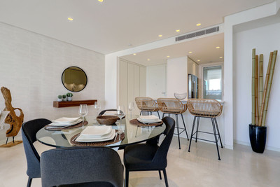 The apartment features two beautifully appointed bedrooms and two luxurious bathrooms, both equipped with walk-in showers and underfloor heating. The master suite is a private haven, enjoying direct access to the expansive terrace and complemented by an elegant en-suite bathroom. A second bedroom and guest bathroom provide equally refined accommodation for family or visitors.