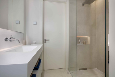 The apartment features a beautifully appointed master bedroom with an elegant en-suite bathroom, while the second bedroom is served by a separate bathroom conveniently located opposite. Both bathrooms are finished to a high standard and feature underfloor heating and luxurious walk-in showers, ensuring year-round comfort and a refined spa-like experience.