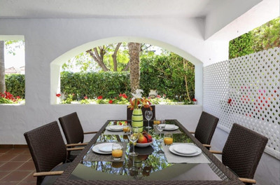 The apartment is very spacious and features a large covered terrace with a chill-out area and outdoor dining space, offering direct access to the well-maintained communal gardens and pool area.