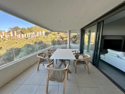 The apartment boasts a generous built area of 112m² and features 3 well-proportioned bedrooms and 2 bathrooms, including a luxurious en-suite master bedroom. The living spaces are thoughtfully designed, with an open plan, fully fitted and equipped kitchen that flows seamlessly into a spacious dining room and living room. Both rooms open onto a private covered terrace, presenting panoramic views of the sea, mountains, countryside, gardens, and communal pool. A stunning terrace of 22m2 with panoramic views. Double glazing, air conditioning, and fitted wardrobes add to the comfort and practicality of the home.