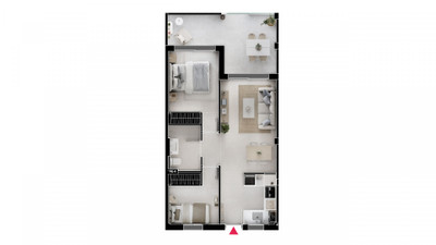 The apartment offers two welcoming bedrooms and a bathroom, as well as a bright living-dining room that opens onto a private south-facing terrace, from which you can enjoy pleasant views of the communal pool and garden. Its functional design includes a fully equipped kitchen, built-in wardrobes, and porcelain floors that add a touch of distinction.