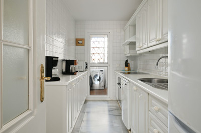 The apartment offers two generous bedrooms, both with built-in wardrobes. The master bedroom features an en-suite bathroom and direct access to the terrace, while the second bedroom is fitted with two single beds that can be arranged together or separately. Both bathrooms have been stylishly renovated and include underfloor heating, adding an extra level of comfort and luxury. A separate fully equipped kitchen and utility room complete the interior layout.