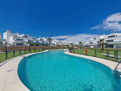 Apartment for sale in Cancelada, Estepona with 2 bedrooms, 2 bathrooms, 1 on suite bathroom and with orientation west, with communal swimming pool, private garage (1 parking spaces) and communal garden. Regarding property dimensions, it has 91 m² built, 73 m² interior and 18 m² terrace. Has the following facilities amenities near, transport near, air conditioning, central heating, fully fitted kitchen, utility room, guest room, storage room, gym, alarm, double glazing, video entrance, brand new, living room, security shutters, laundry room, internet – wi-fi, 24h service, gated community, lift, pool view, unfurnished, close to children playground, close to sea / beach, close to golf, close to shops, close to town, close to schools and surveillance cameras.