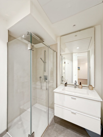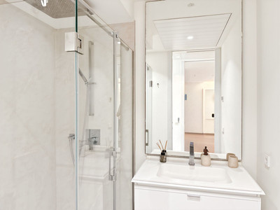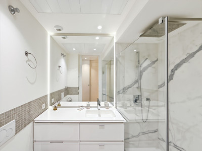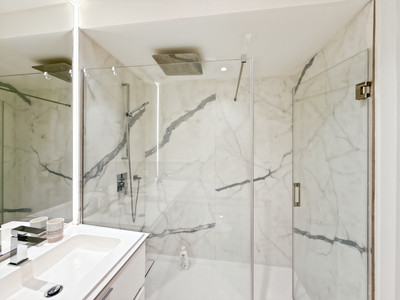 The glazed terrace of over 30 m² extends your living space outdoors — a place to breathe, relax, simply be. When night falls, the two bedrooms offer a quiet retreat. The master suite features an integrated safe, a detail that brings true peace of mind. Bathrooms are designed as spa-like spaces, complete with walk-in rain showers and elegant finishes.