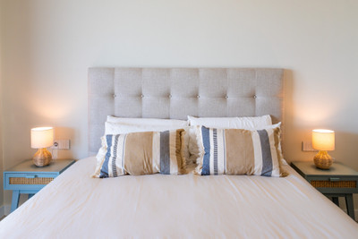 The open-plan living room, creates an inviting and serene space for relaxation. It opens seamlessly onto a large private terrace equipped with comfortable outdoor seating, ideal for al fresco dining or simply soaking in the panoramic sea views.