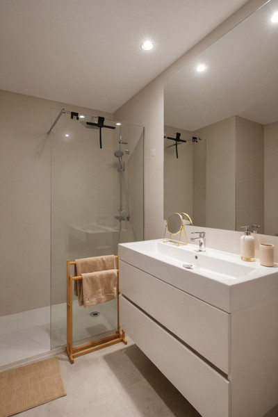 The apartment features two generously sized bedrooms, both filled with natural light and decorated in soothing neutral tones which provides direct access to a private terrace, offering the perfect spot to enjoy your morning coffee or unwind in the evening. The two bathrooms are beautifully designed with contemporary fixtures with underfloor heating