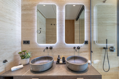 The expansive 102m² terrace is a standout feature, offering both covered and uncovered areas to enjoy the Mediterranean climate. Residents can indulge in a private pool, a jacuzzi, and a sauna, all complemented by access to a communal indoor pool and a fully equipped gym. The gated community provides 24-hour security with surveillance cameras and video entrance systems, ensuring peace of mind. Modern conveniences such as electric blinds, fibre-optic internet, satellite TV, and fitted wardrobes further enhance the living experience.