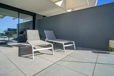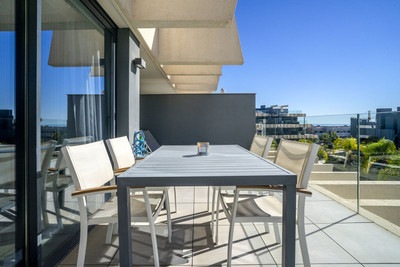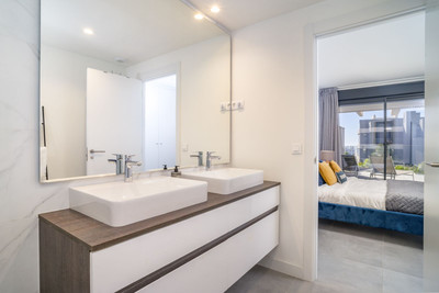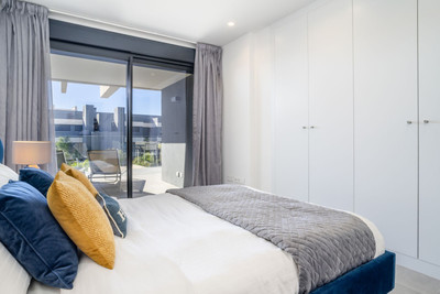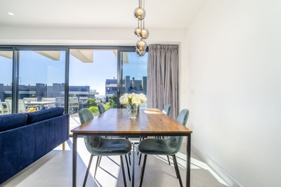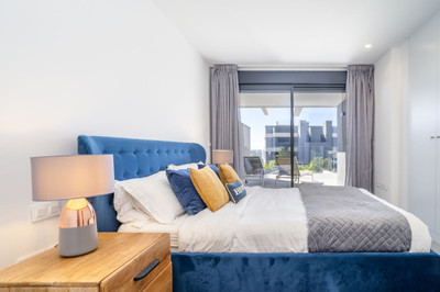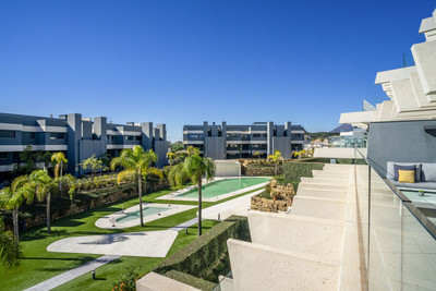 The apartment enjoys a privileged south-facing orientation, allowing natural light to flood the interior throughout the day. The spacious open-plan living and dining area connects seamlessly with a generous 27.83 m² terrace, creating a harmonious indoor-outdoor living experience. From here, you enjoy open views over the beautifully landscaped gardens and communal pool area, as well as a subtle glimpse of the Mediterranean.