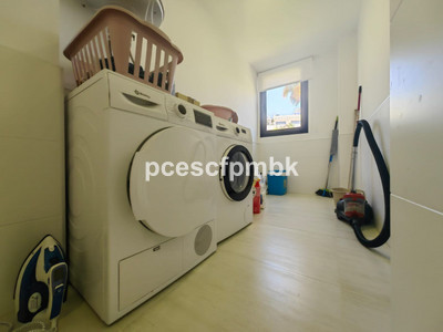 The apartment offers three generously sized bedrooms and two bathrooms, including a master suite with en-suite bathroom. Designed for practical modern living, the property also benefits from a separate laundry room equipped with a washing machine, dryer, and ample built-in storage.