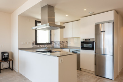 At the heart of the home lies a sophisticated open-plan living area, seamlessly integrating the kitchen, dining, and lounge spaces. The fully fitted kitchen is equipped with high-end appliances and designed for both functionality and social interaction. Floor-to-ceiling sliding glass doors disappear seamlessly into the structure, creating a fluid transition between indoor and outdoor living—perfectly suited to the region’s exceptional climate. The indoor climate is regulated by integrated air-condition (areothermia) and under floor heating through out the whole apartment.