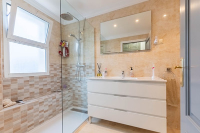 The apartment is presented in excellent condition and has been freshly painted throughout. The master bedroom features an upgraded en-suite bathroom with a walk-in shower and double vanity, along with direct access to the terrace. The two additional bedrooms are both well-proportioned, each with double beds, bedside tables, ample storage, and attractive views. The second bathroom has also been upgraded and includes a walk-in shower and modern vanity units.