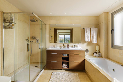There are three generous bedrooms, all with fitted wardrobes and plenty of storage. The principal bedroom enjoys its own stylish ensuite bathroom and direct access to the terrace, allowing you to wake up to the scenery of the golf course and Mediterranean Sea. The additional two bedrooms are well‑proportioned and share a beautifully appointed family bathroom. High‑quality fixtures, marble finishes and a sense of understated luxury run throughout the sleeping and bathing areas.